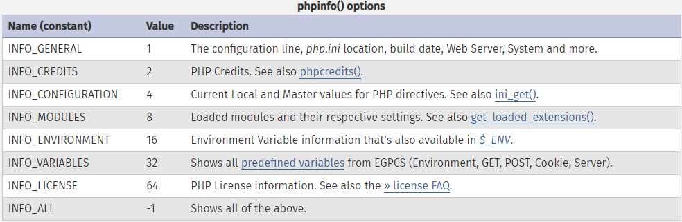 php 공식 문서에 있는 phpinfo() 에 대한 옵션 설명이다. 참고하면 좋을듯